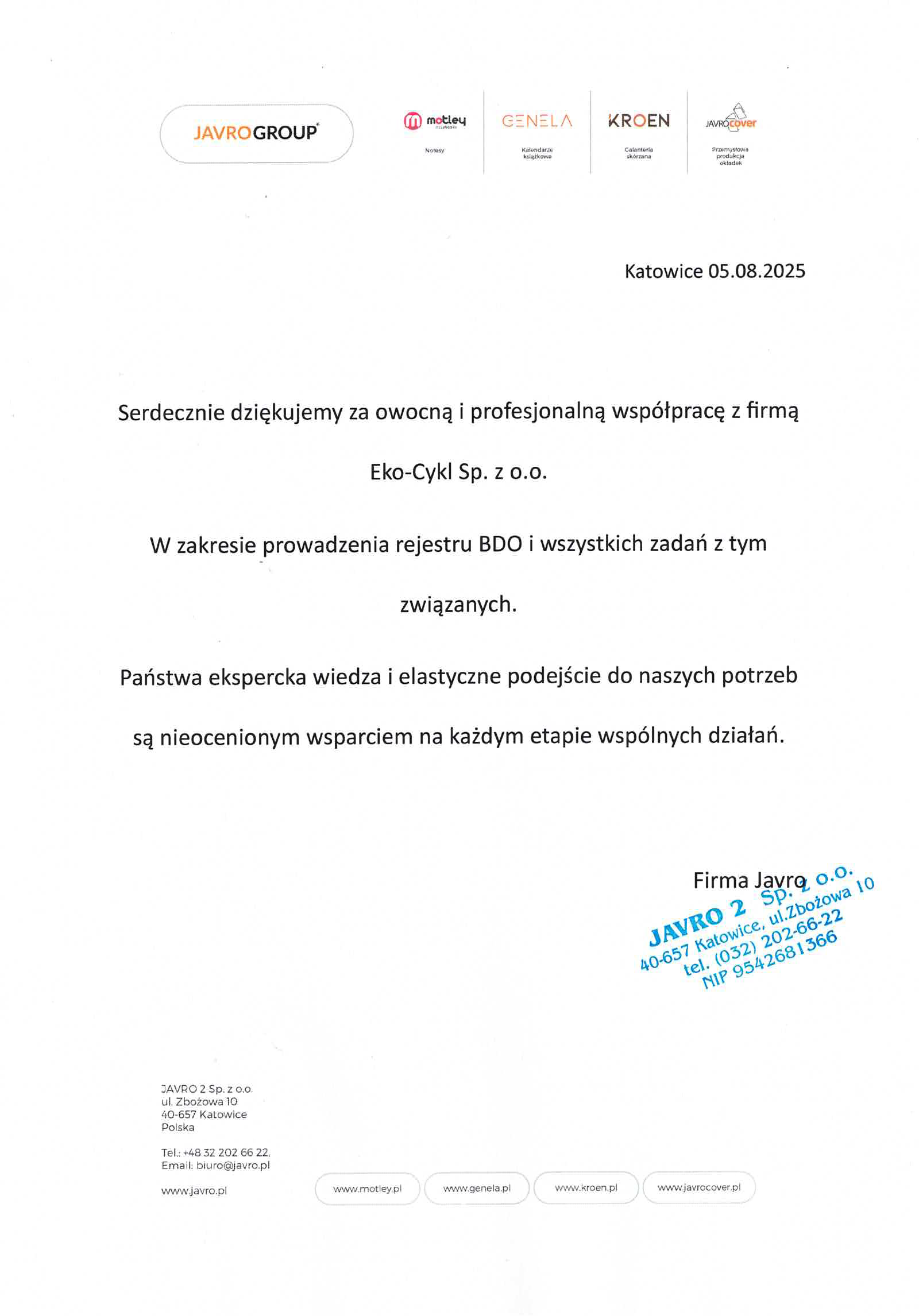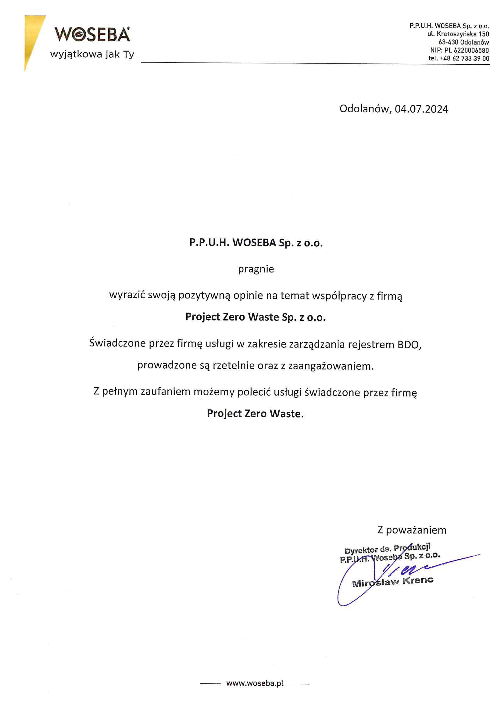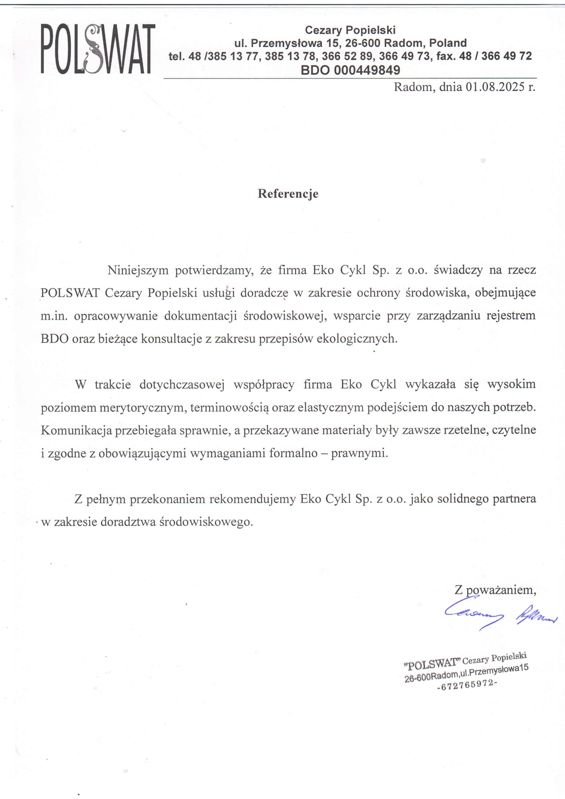 Otrzymywane referencje i opinie potwierdzają nasze zaangażowanie w realizację obowiązków środowiskowych oraz indywidualne podejście do potrzeb każdego przedsiębiorstwa. To dla nas motywacja do dalszego rozwoju i utrzymywania najwyższych standardów współpracy.