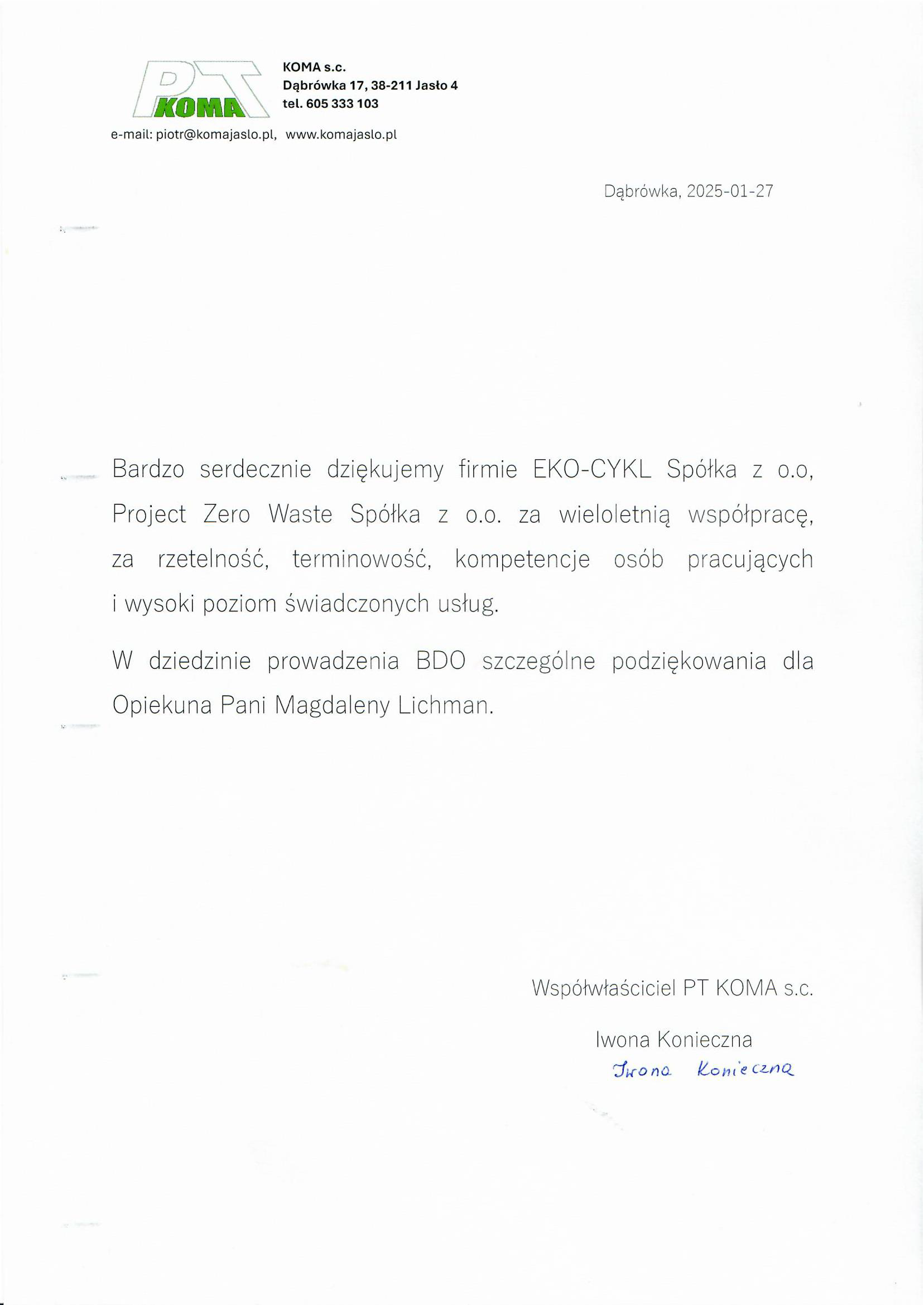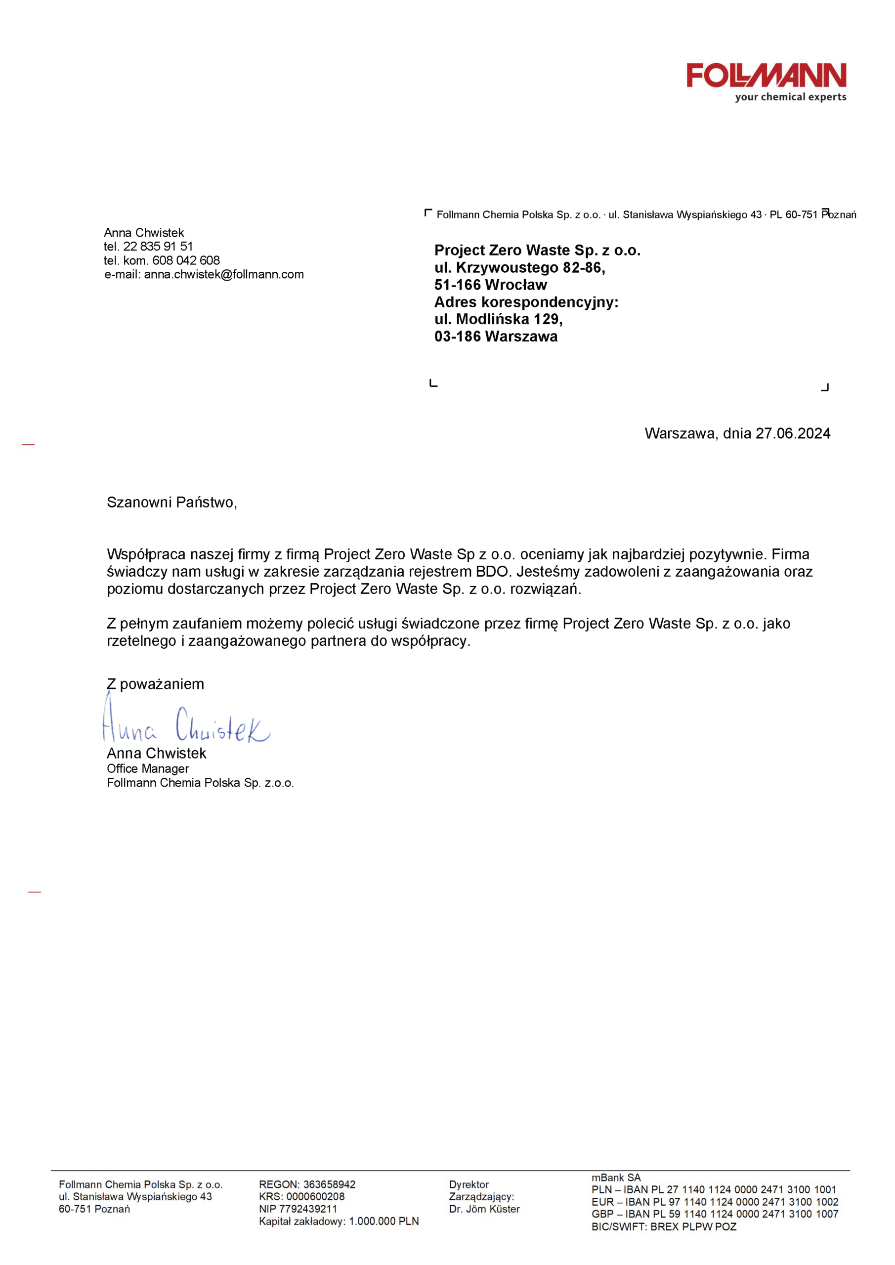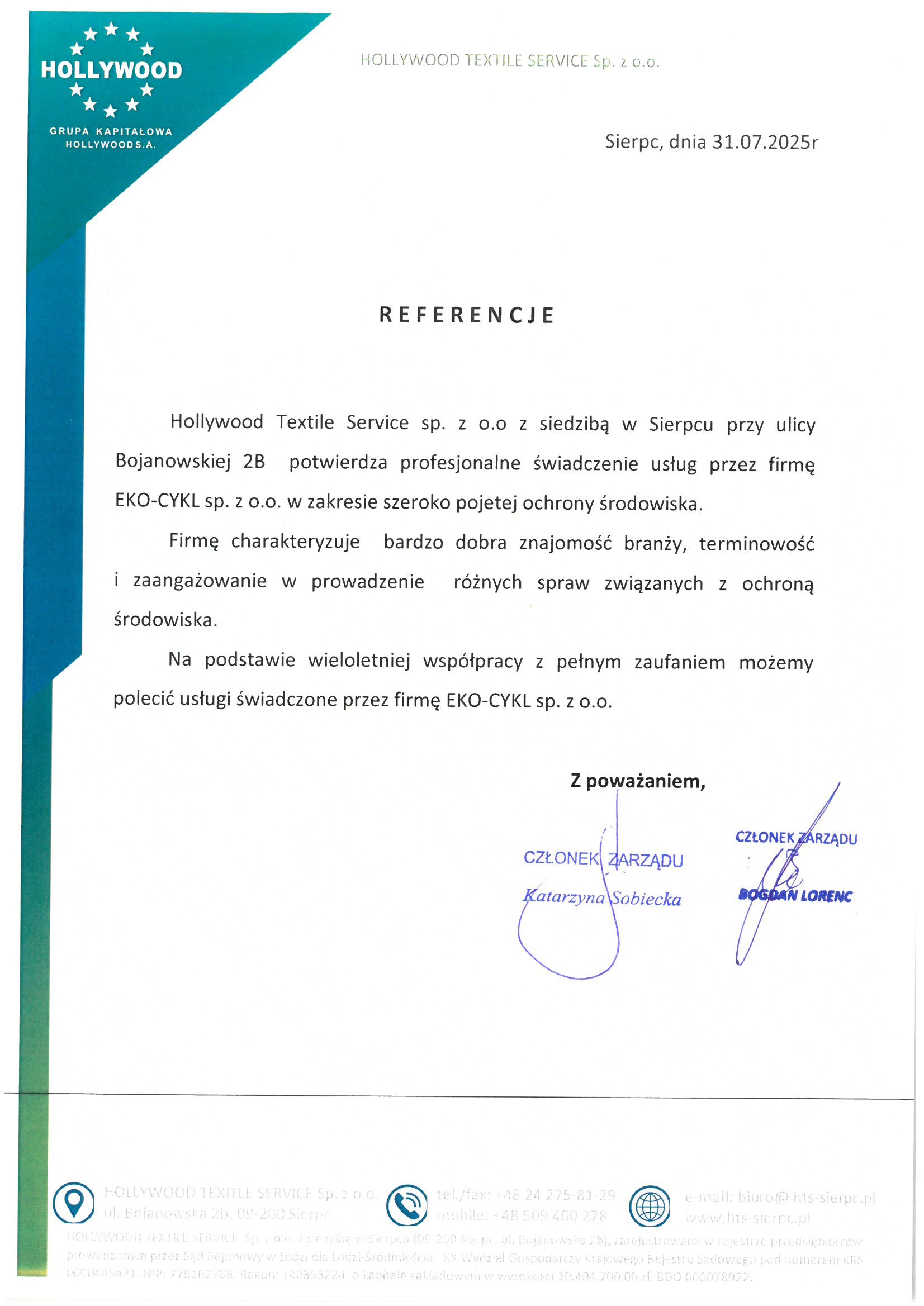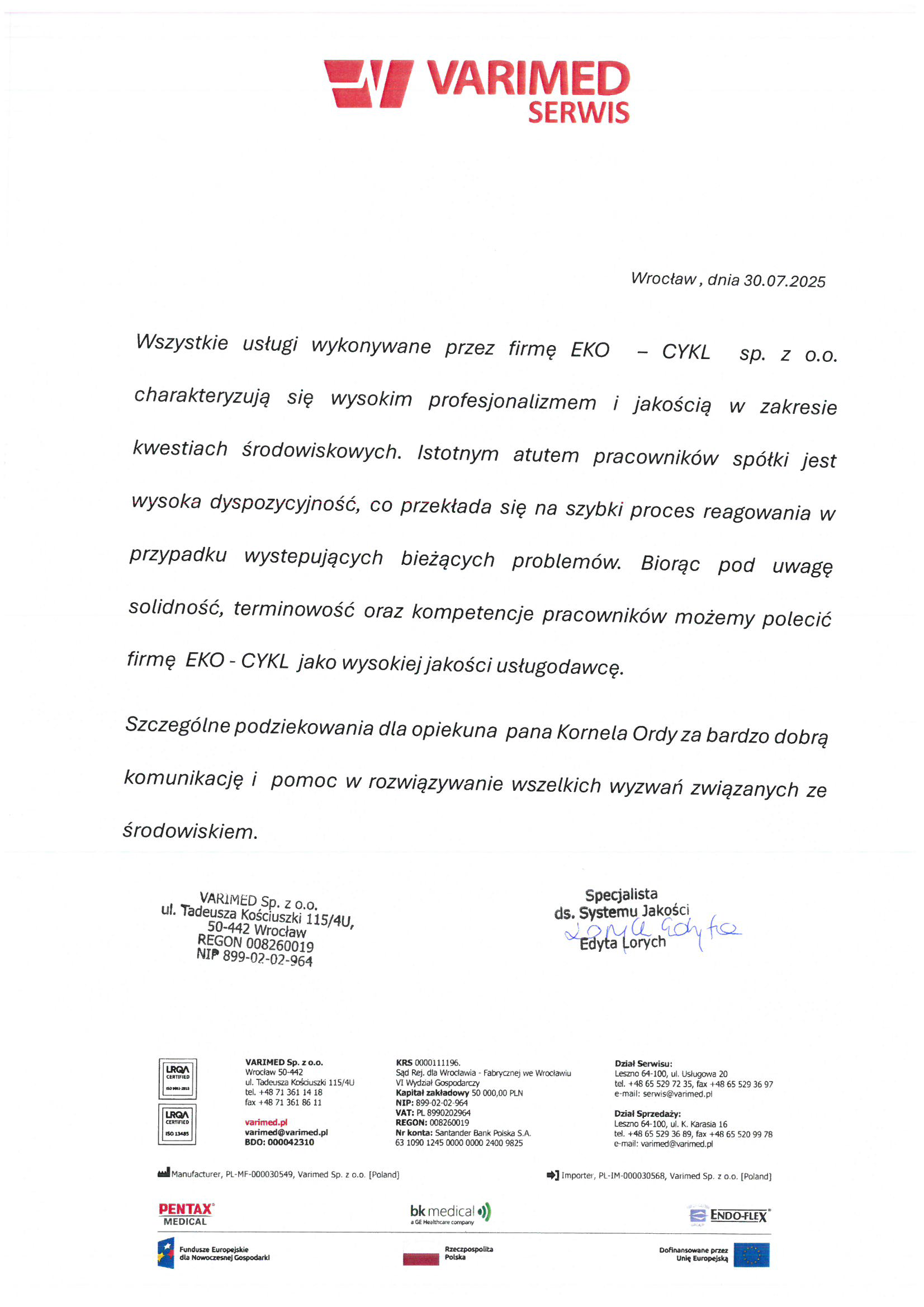 Otrzymywane referencje i opinie potwierdzają nasze zaangażowanie w realizację obowiązków środowiskowych oraz indywidualne podejście do potrzeb każdego przedsiębiorstwa. To dla nas motywacja do dalszego rozwoju i utrzymywania najwyższych standardów współpracy.